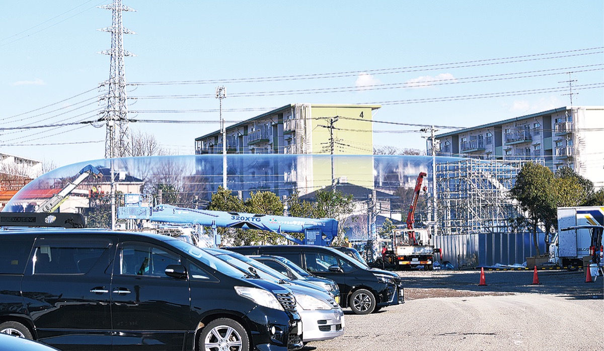町役場と図書館の間に広がる駐車場(公共施設予定地)の一部が、3月上旬まで広告撮影に貸し出された。普段は空いているスペースに重機が集まり、住宅街に突然現れた透明な構造物に驚く人もいた。