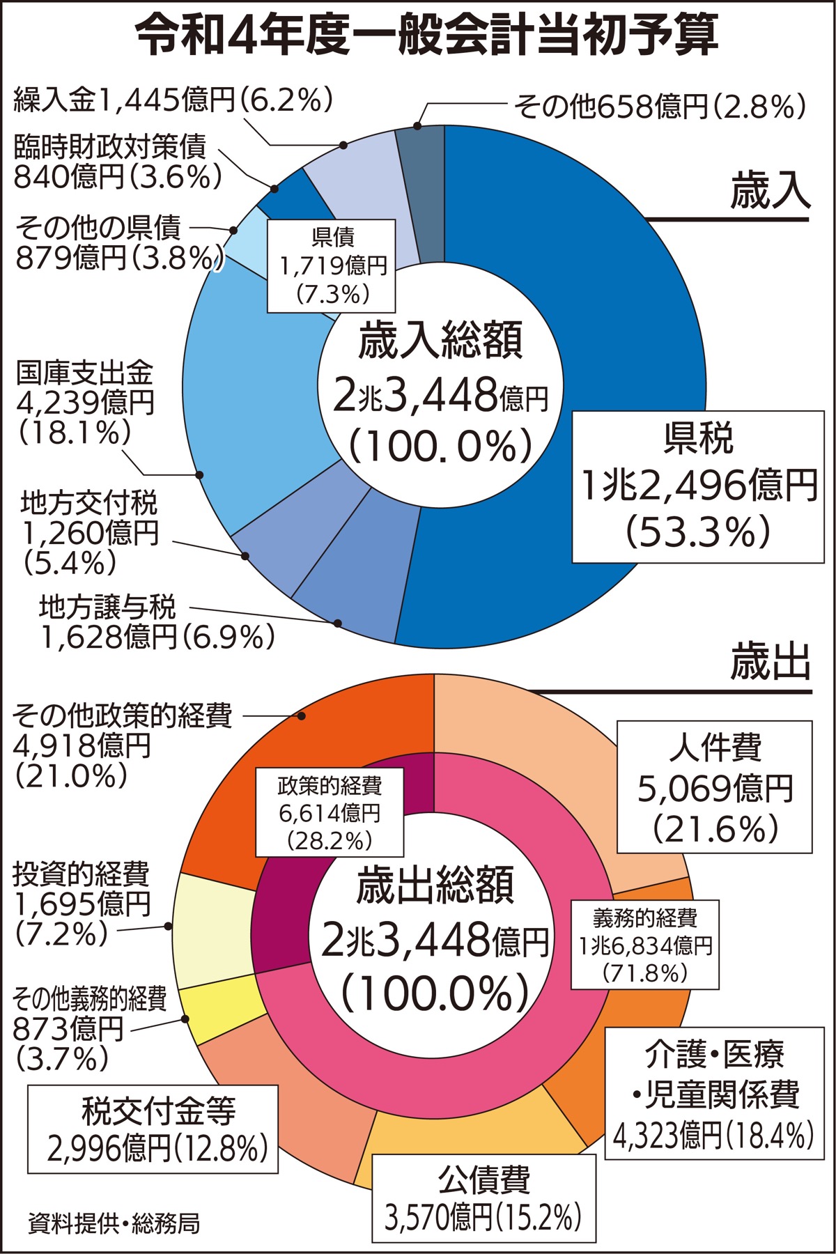 ▽コロナ禍における、県民の「いのち」を守るための医療提供体制の確保と、県民の「暮らし」を守るための県内経済の回復に向けた支援として、総額3912億9899万円。▽水害や土砂災害から県民のいのちと財産を守るための急傾斜地崩壊対策の拡充等として、508億1694万円。▽児童生徒の安全性を確保するための校舎等の耐震化、老朽化対策、トイレの洋式化・空調設備等の教育環境整備・改善として、301億641万円。▽交通信号機の更新期間を12年から7年に短縮するなどの交通安全施設整備の加速化等として、57億6747万円。▽コロナ禍で、子ども・女性、孤独・孤立等に陥っている生活困窮者対策の更なる推進として、6億9233万円。