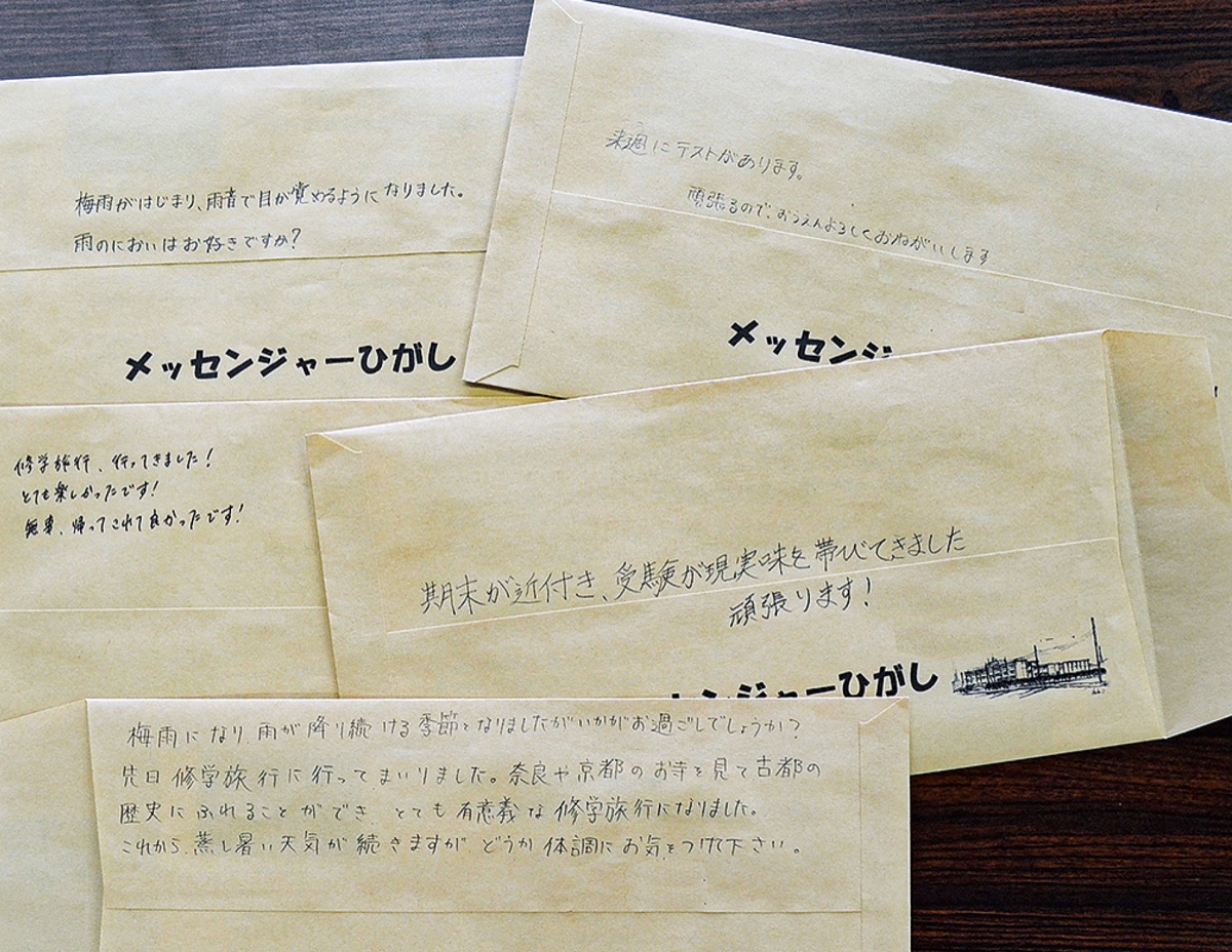 コロナの感染状況が落ち着いてきたこともあり、学校では今年1月から生徒による配布を再開。その際、「メッセージを書いたら喜んでもらえるのではないか」と生徒に呼び掛けたところ、参加者全員が賛成。封筒の裏面に、近況や体調を気遣うコメントなど、思い思いのメッセージをしたためた。