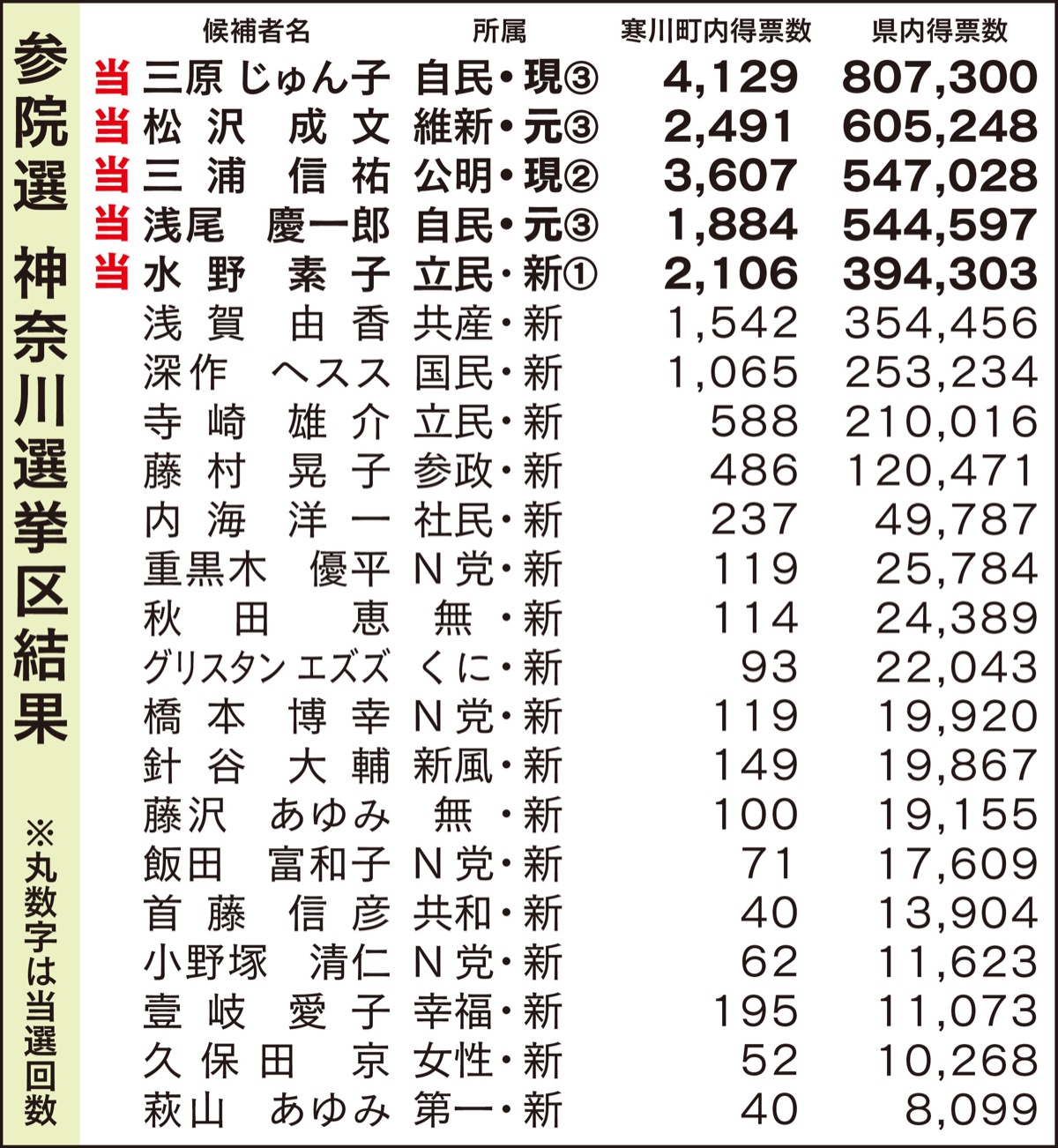 参議院議員選挙の投開票が7月10日に行われた。改選4と欠員補充1の計5議席を過去最多の22人で争った神奈川選挙区は、自民党の現職・三原じゅん子氏(57)が約80万7千票を獲得し、トップ当選。以下、日本維新の会の元職・松沢成文氏(64)、公明党の現職・三浦信祐氏(47)、自民党の元職・浅尾慶一郎氏(58)、立憲民主党の新人・水野素子氏(52)が当選した。