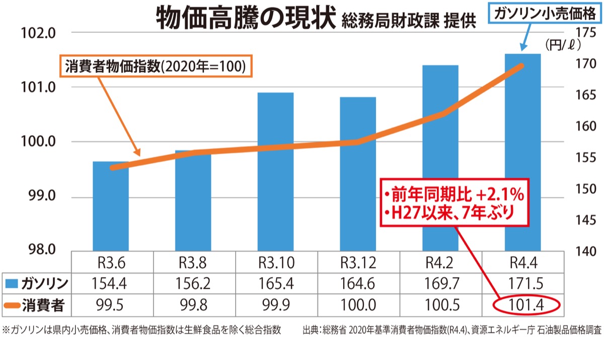 ウクライナ情勢が長期化するなか、原油価格や円安などで県経済の下振れリスクが高まり、税収への影響が懸念されますが、今回の補正予算では、国の総合緊急対策を踏まえて、物価高騰等に伴う県民生活や県内経済への影響を緩和するための生活者支援や、事業者支援の取り組みを中心に編成されています。
