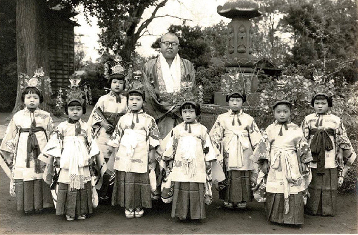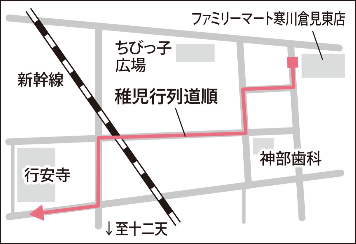 行安寺では、総代家(ファミリーマート寒川倉見東店そば・下部地図参照)から稚児を伴う練り行列で寺へ向かい、代々伝わる衣や過去帳などが伝授され、金田住職の就任を報告する。