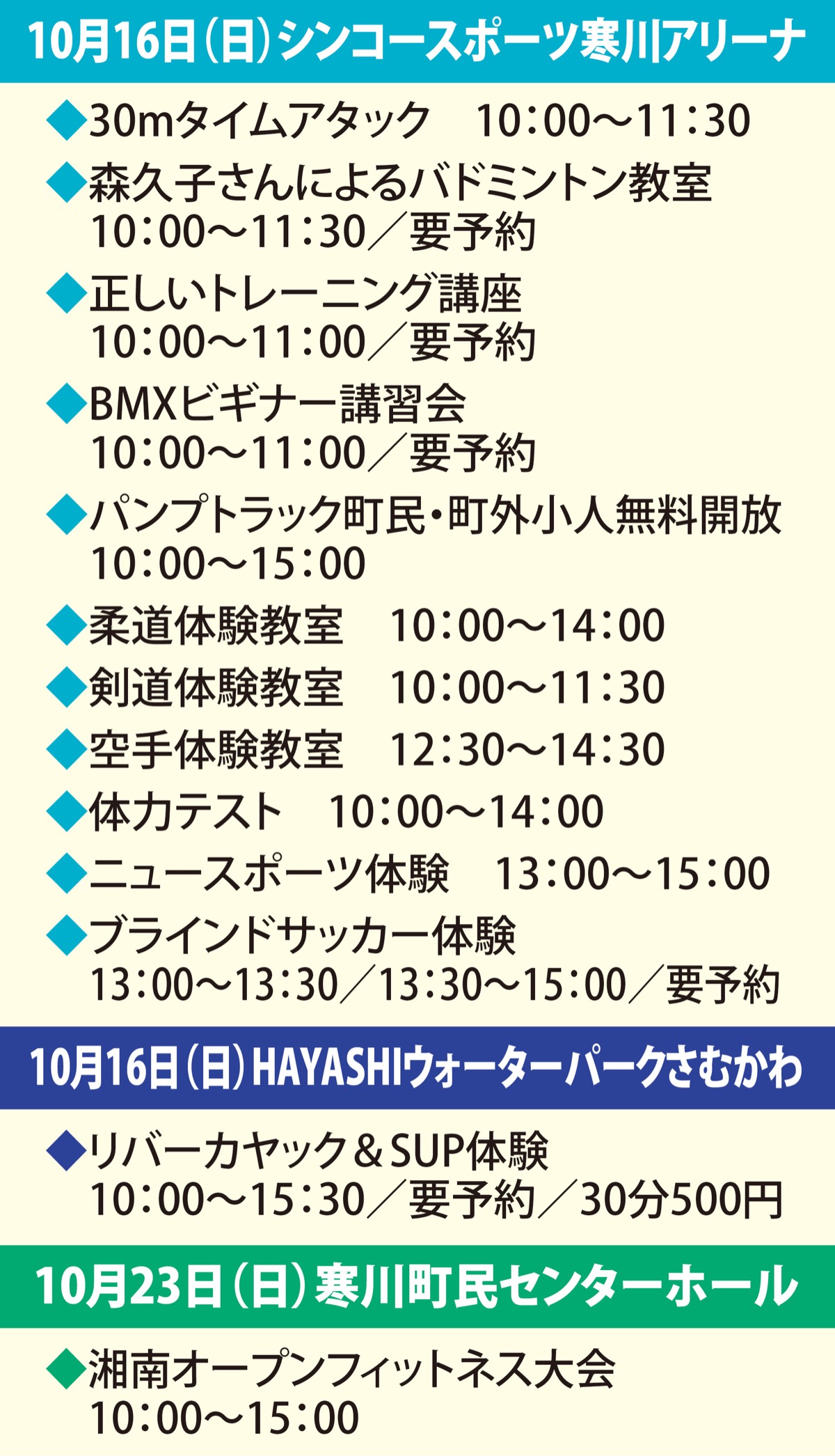 10月16日(日)はシンコースポーツ寒川アリーナで、バドミントン教室やBMXビギナー講習会、ブラインドサッカー体験などが行われる他、HAYASHIウォーターパークさむかわでリバーカヤック&SUP体験などを実施。23日(日)は、寒川町民センターで湘南オープンフィットネス大会が開催される。