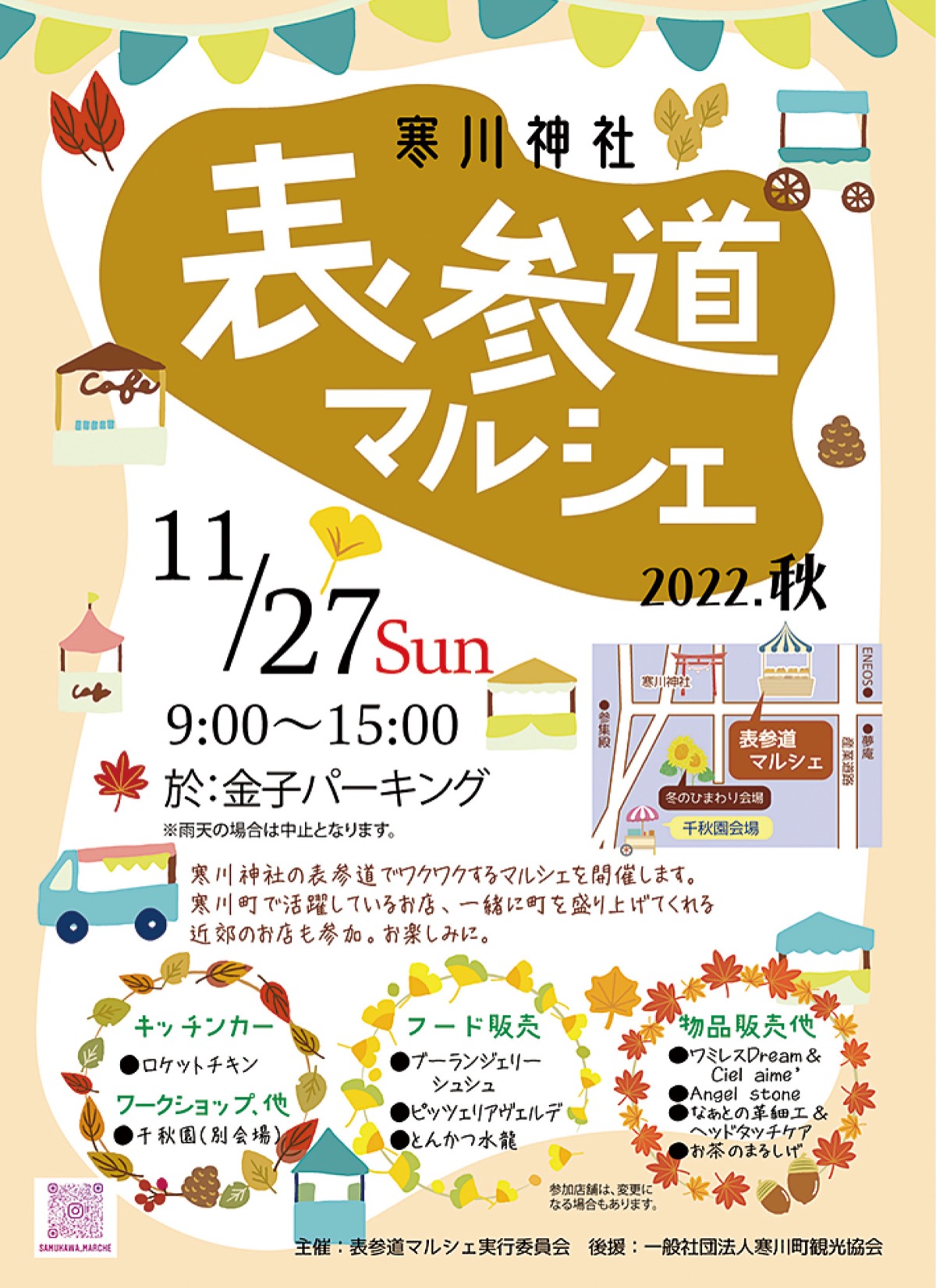 町内の商店や生産者、地域をつなぎ、「賑わい創出の起爆剤にしたい」と、寒川神社の表参道(金子パーキング/宮山350)で11月27日(日)、午前9時から午後3時まで「表参道マルシェ」が初開催される(雨天中止)。主催/同実行委員会(中橋誠水委員長)、後援/寒川町観光協会。