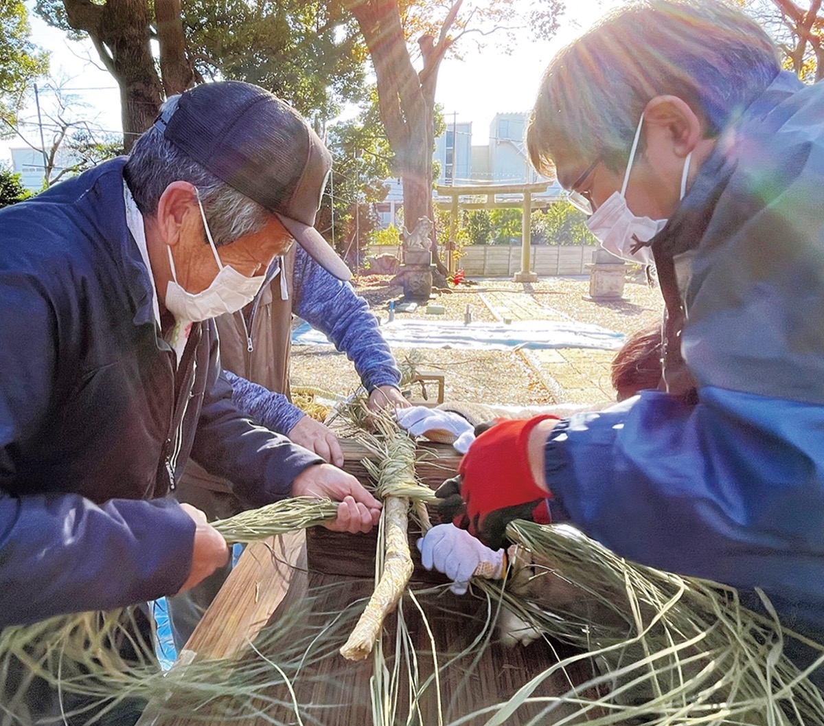 倉見神社の関係者が12月10日、11日、しめ縄作りを実施した=写真。新年を迎える準備として毎年行っているもので、今年は約30人が参加。拝殿、神輿殿、社務所、手水舎用のしめ縄を手作りした。