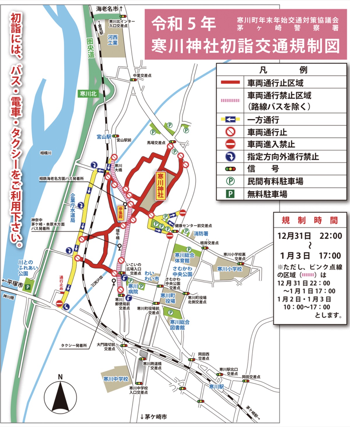寒川神社周辺の交通規制は、例年通り12月31日午後10時から1月3日午後5時まで、一部を車両通行禁止や一方通行化する。町町民安全課では「公共交通機関の利用を。規制区域内での自転車通行はご遠慮ください」と呼び掛けている。