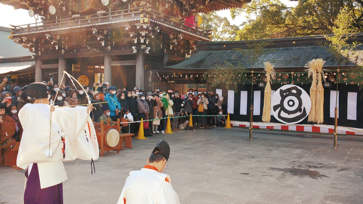 寒川神社で1月8日、悪疫を退散させ今年1年の吉凶を占う新春恒例の神事「武佐弓祭」が行われた。