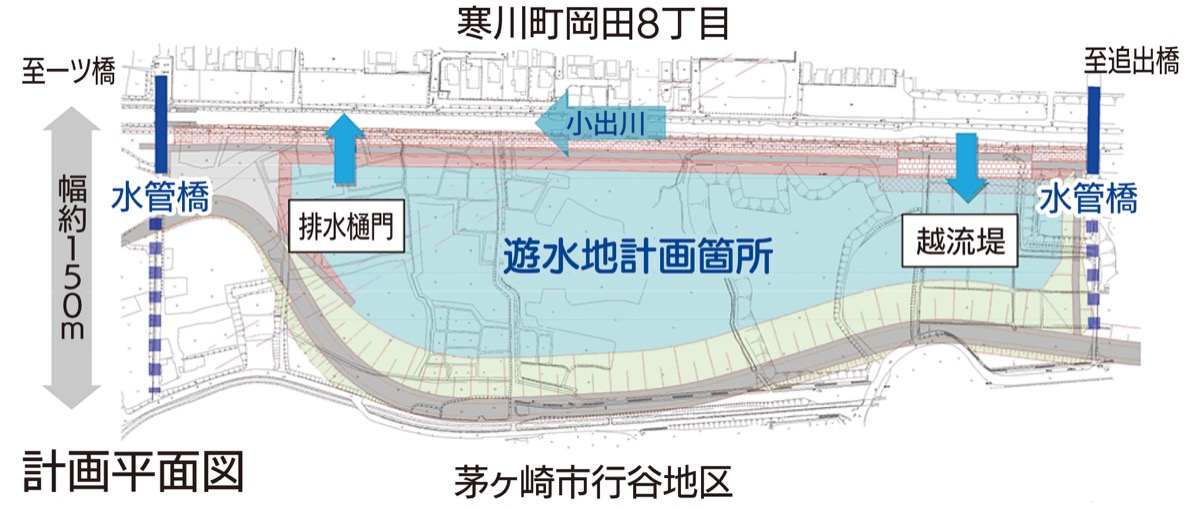 整備される遊水地は面積約5・5ha、貯留量は約9万㎥、洪水調節量20㎥/sの規模となります。遊水地が整備されることにより、大雨等によって起こる洪水を遊水地の中に一時的に貯めることで、下流に洪水が一気に流れ出すことを防ぎます。