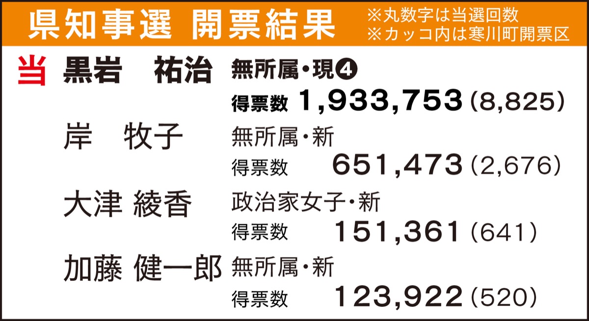 無効票が約21万票あり、前回の約2・4倍。投票総数に対して6・91%で、黒岩氏が初当選した2011年以降では最も高い割合だった。投票率は40・35%で過去最低だった前回を0・07ポイント上回った。