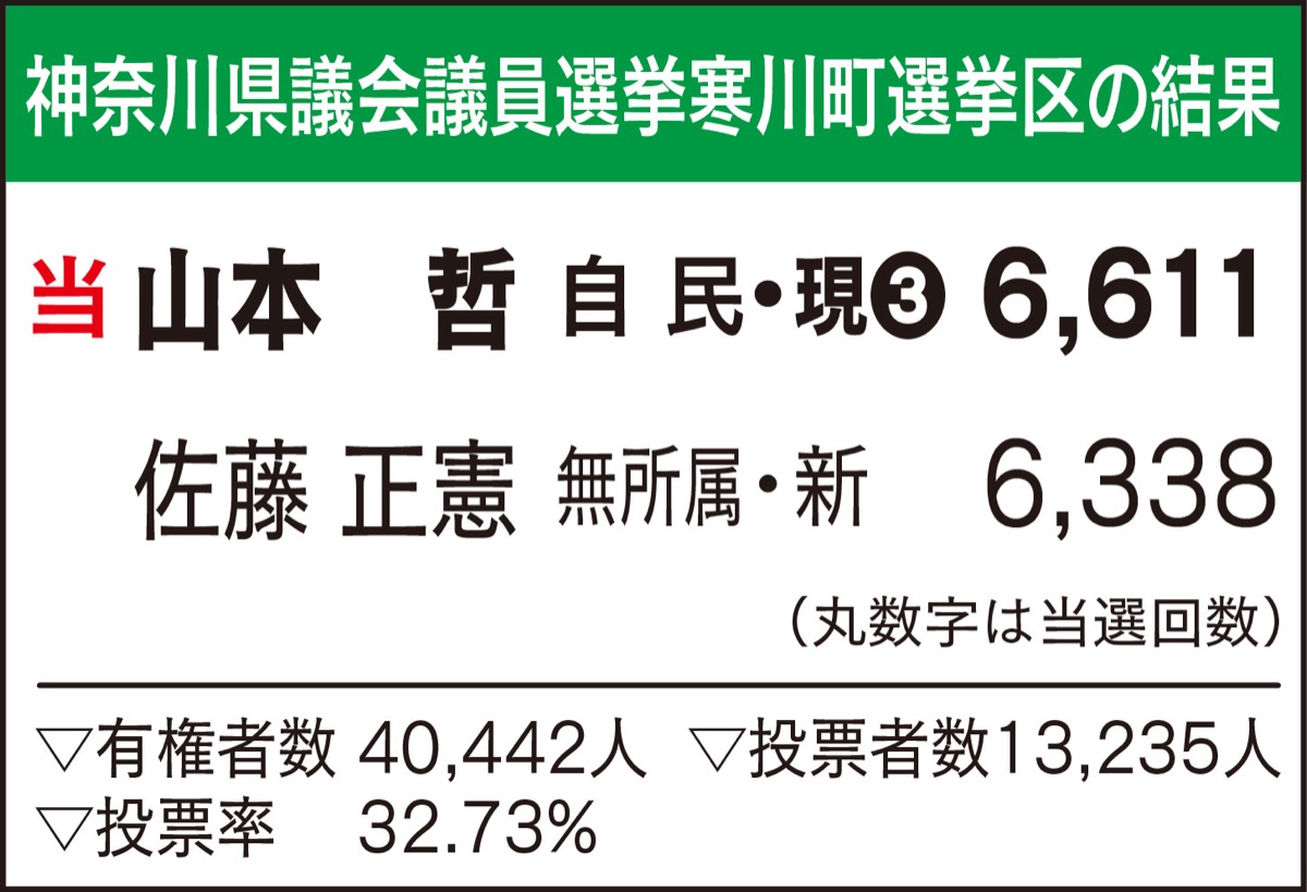 任期満了に伴う神奈川県議会議員選挙(寒川町選挙区・定数1)は9日に投開票され、現職の山本哲氏(53・自民党)が新人との一騎打ちを制し、再選を果たした。前回は無投票で8年ぶりの選挙戦。投票者数は1万3235人で、投票率は前回の40・12%を7・39ポイント下回る32・73%だった。