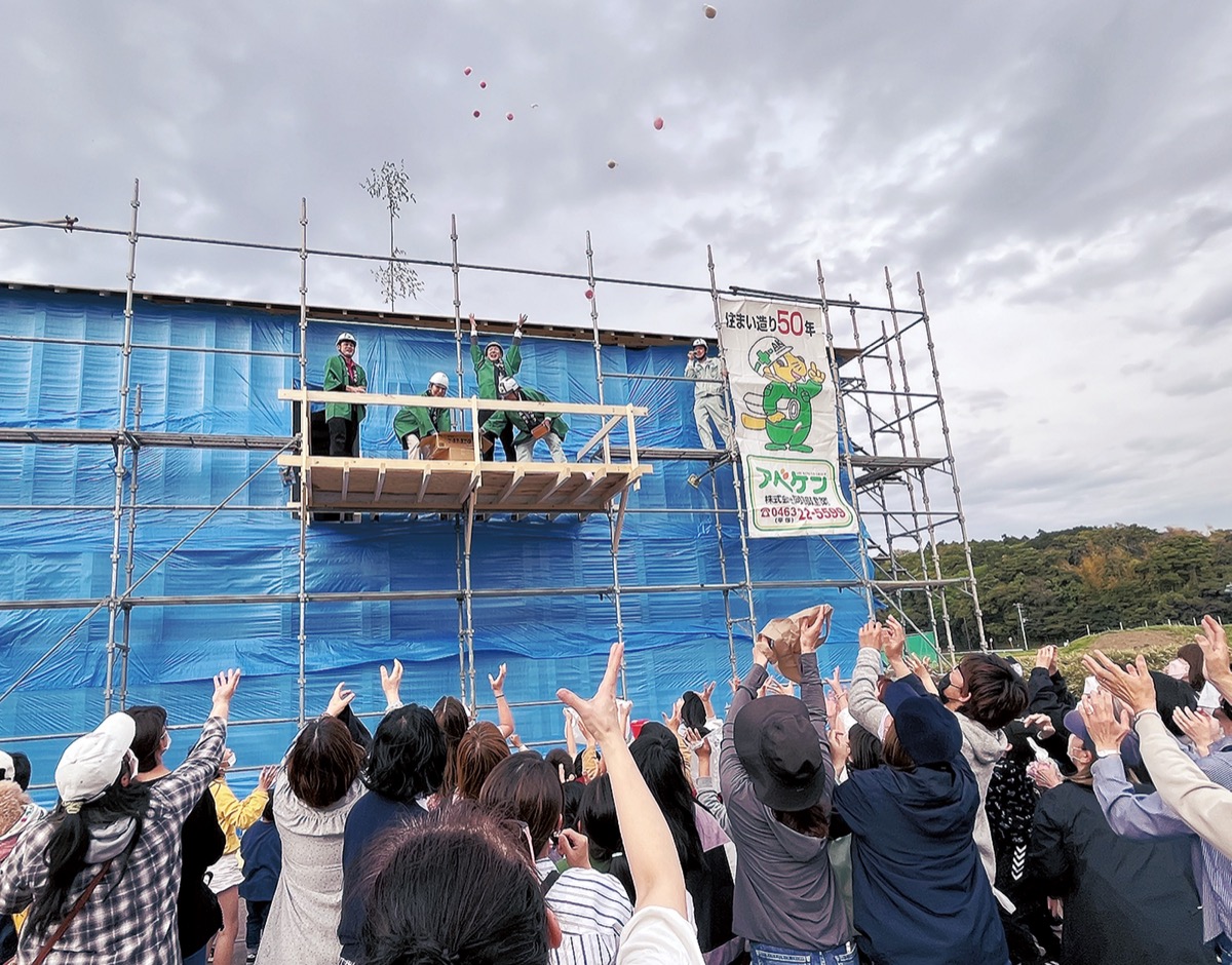 寒川町岡田で建築が進む「リアン寒川老人ホーム」の新築工事が上棟し、4月12日に「餅まきとお菓子まき」が行われた=写真。当日は、100人を超える近隣住民が集まり、事業主の株式会社リアン代表取締役社長の田中秀学さんや、施工主のアベケン代表取締役の阿部利昭さんらが豪快に餅をまき、歓声とともに盛り上がりをみせた。