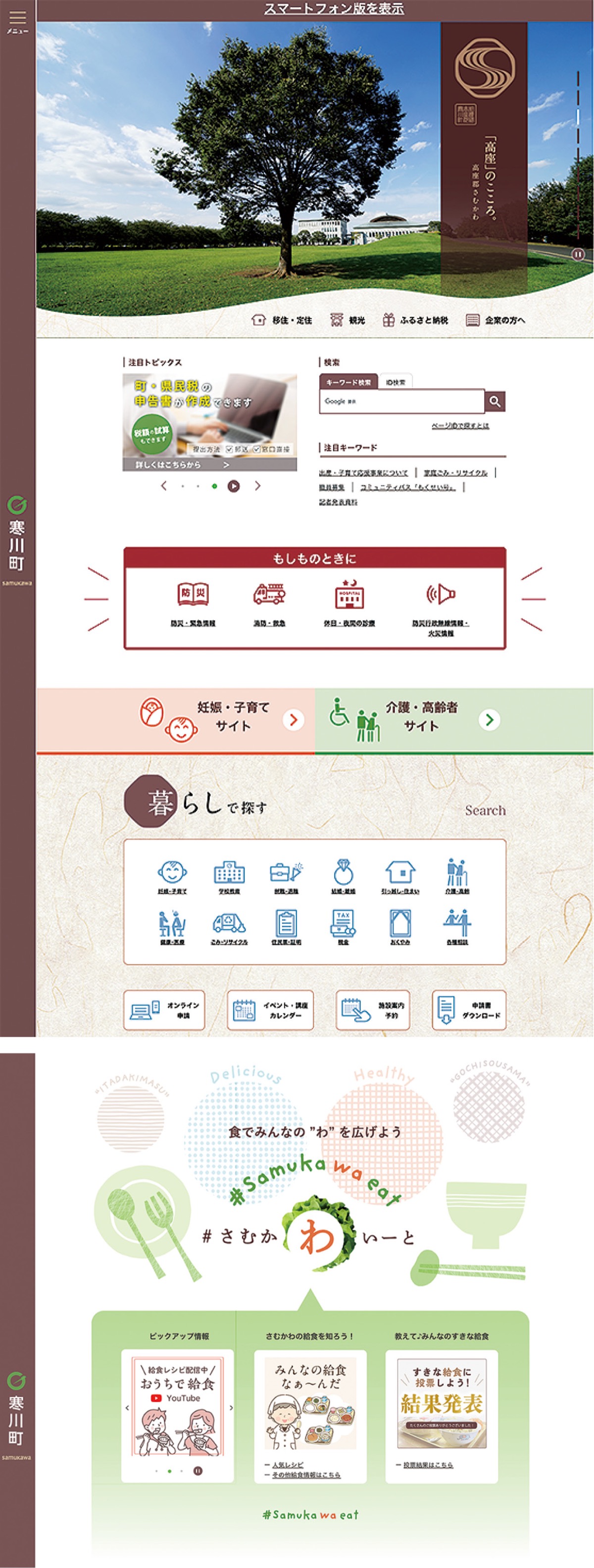 昨年10月にリニューアルした町ホームページ。トップは、町ブランドスローガンの『「高座」のこころ。』を表現した和モダンな雰囲気と色使いで仕上げ、誰もが見やすく、欲しい情報がすぐ見つかるように、デザインや構成を見直して制作された。