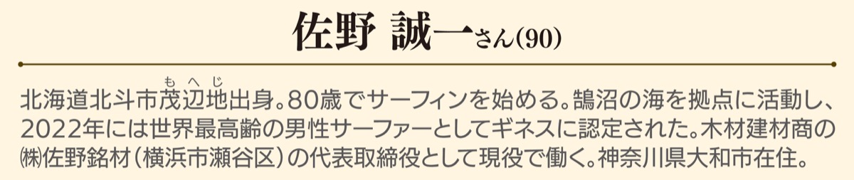 80歳でサーフィンを始め、世界最高齢の男性サーファーとしてギネスにも認定されている佐野誠一さん(90)。「『高齢だから』と諦めるのは好きじゃない。まだまだ、これから」と話す佐野さんに、人生100年時代を豊かに生きるヒントを聞いた。