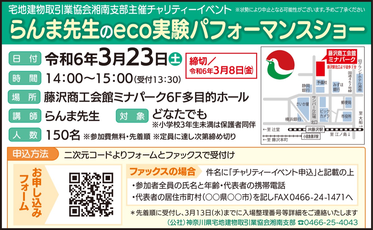 (公社)神奈川県宅地建物取引業協会湘南支部(水落雄一支部長)では親子で楽しめるチャリティーイベントを3月23日(土)、藤沢商工会館6階で開催する。午後2時から3時。参加無料。