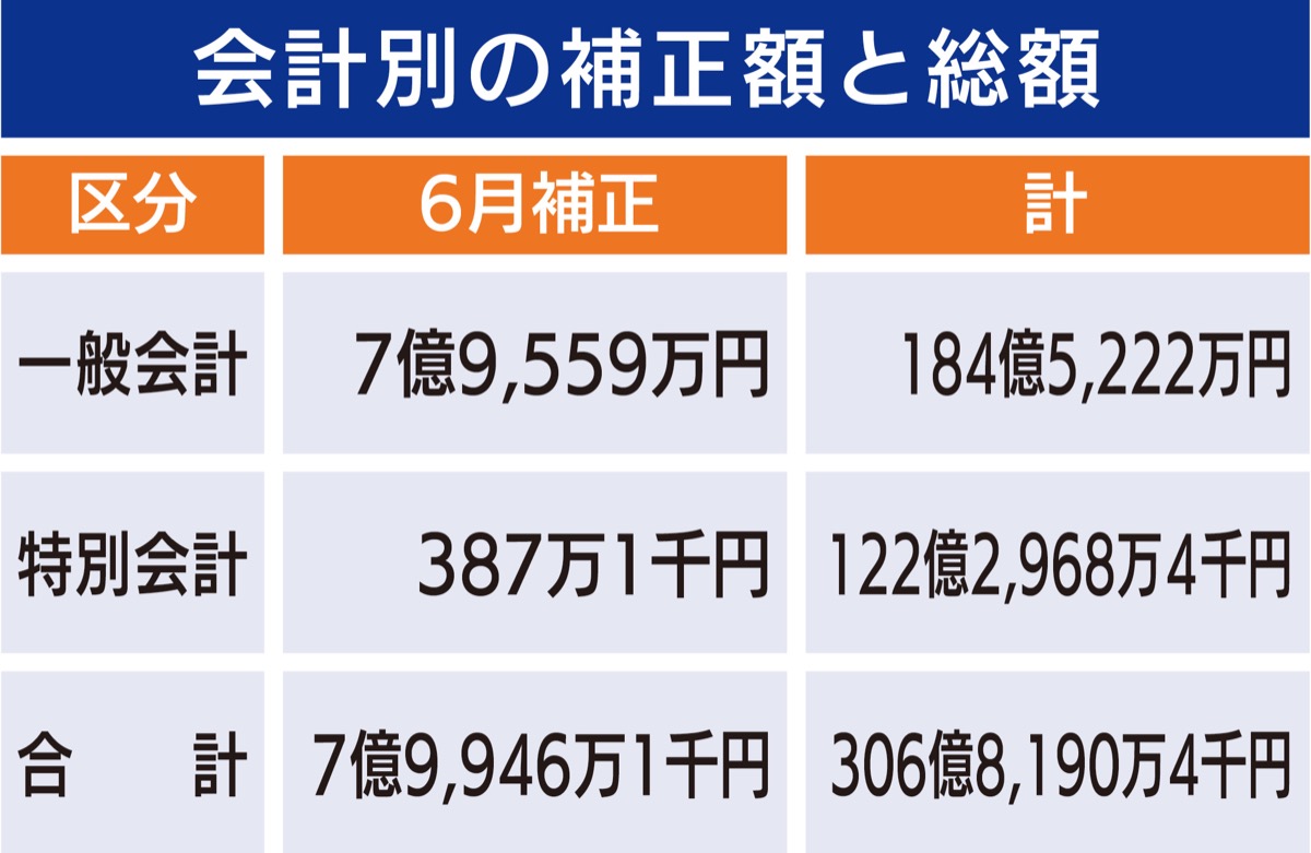 補正予算案には、低所得世帯への10万円支給や18歳以下の児童へ5万円を給付する「低所得世帯支援給付金給付事業」に1億9219万8千円、6月1日から始まった所得税と住民税の定額減税で減税しきれない分を給付で補うための事業費として4億4204万6千円などを計上した。