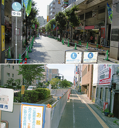 平塚市は放置自転車禁止区域となるパールロードの一部交差点付近に、少し異様にも見えるカラーコーンとコーンバーの囲いを設置した。放置自転車対策のための苦肉の策だ。