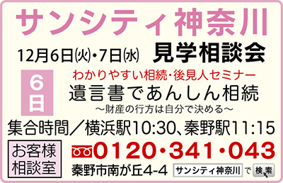 12月6日(火)・7日(水)には見学・相談会が開催される。6日は相続・後見セミナー「遺言書であんしん相続」も。専門家が遺言書の書き方などを分かりやすく解説する。申込みは12月2日(金)迄にお電話を。