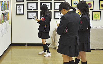”1日記者”を務めたのは原田理央さん、宮腰奈々さん、山本葵さんの女子生徒3名。当日は、当紙記者から記事の書き方を簡単に学んだ後、市美術館の市民アートギャラリーで行われていた平塚・大磯・二宮地区中学校美術展を見学し、取材活動を行った。