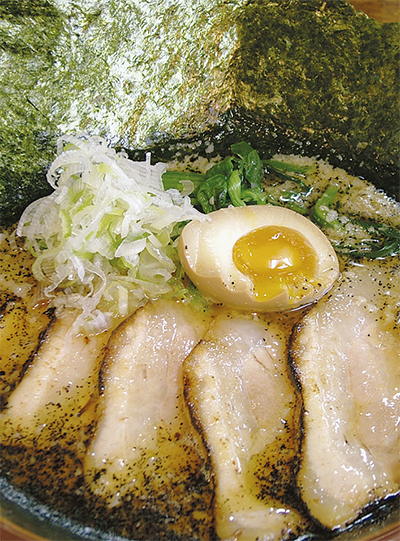 繁盛店の看板は、店主のこだわりが詰まった極上マー油チャーシューメン。数種の野菜と煮込んだ豚鶏スープに、胡麻ニンニクの香り立つ黒マー油が食欲をそそる。時間をかけて仕込む自慢の豚バラ叉焼は、箸で解(ほつ)れる柔らかさ。中太ちぢれ麺も汁によく馴染む。