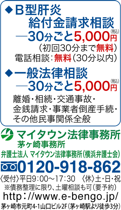 茅ヶ崎のマイタウン法律事務所では、B型肝炎の給付金受領についての無料法律相談と電話法律相談を実施している。同事務所の吉岡弁護士は「B型肝炎ウイルスに感染していても、その原因が集団予防接種にあると知らされていない人も多くいるようです。弁護士には守秘義務があり、相談内容を第三者に漏らすことはないので気軽に相談してほしいですね」と話す。
