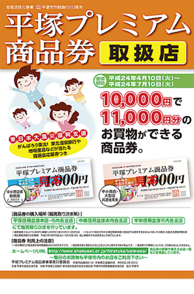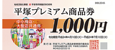 商品券は額面千円券が11枚セットで、5枚は中小商店等で使え(大型店では使用不可)、6枚は中小商店・大型店で利用できる。平塚信用金庫本店と市内支店、中南信用金庫及び中栄信用金庫の市内支店を通じ、4万冊を発行する。