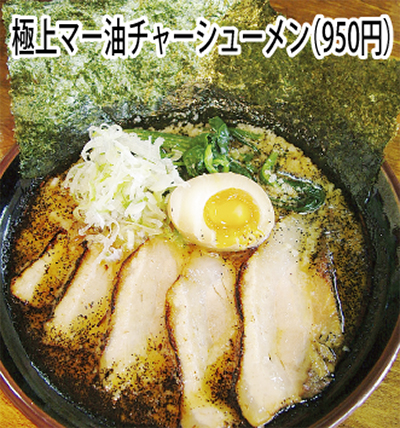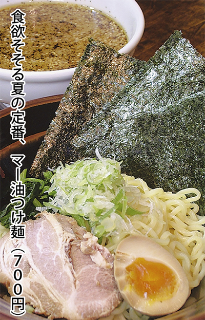 専門誌でも紹介される看板の品「極上マー油ラーメン」をつけ麺スタイルでいただくのが、店に通う常連客の夏の風物詩。スープは、野菜と熟成させた鶏豚出汁に芳ばしい黒マー油を添え、つけ麺ならではの酸味も少々。冷水でしめた中太麺にたっぷりと絡ませ、つるりといただく。