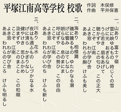 大正10年4月に県立平塚高等女学校として創立。昭和25年に県立平塚江南高等学校と改称し、男女共学を実施。現在の校歌は創立30周年記念事業として、昭和26年9月に制定された。