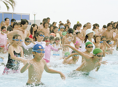 大磯ロングビーチのプール開きが7日に行われ、夏の到来を告げた。当日のプールには地元の家族連れやプリンスホテルの女子社員らが招かれ、プール開きの宣言と同時に波のプールへ一斉に飛び込んだ=写真。