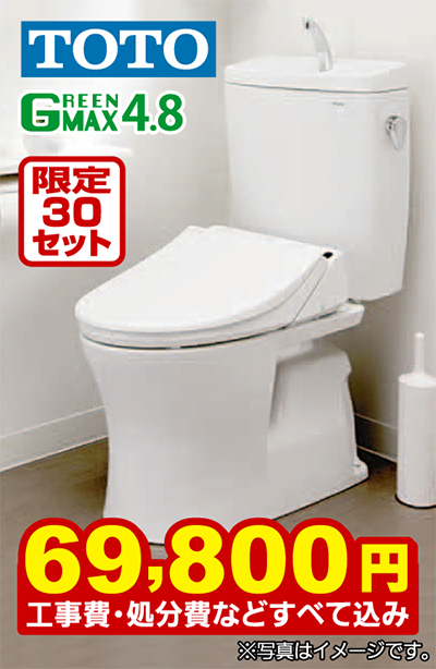 全国63カ所の直営スタッフが伺う「安心」と「信頼」のクラシアンでは、TOTOの超節水トイレ「GREEN MAX4.8 ピュアレストQR」を通常価格14万7000円を工事費・処分費込みの6万9800円で販売。さらに、温水洗浄暖房便座(脱臭付き)を希望の方は、プラス2万5000円にて受付。仕入から施工まで、一貫して手掛けることで実現できた低価格。「金額が他社よりも高い場合は、お気軽にご相談ください」とのこと。クレジットでの支払いも可能です。