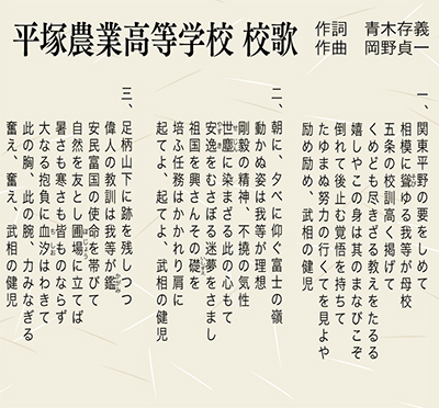 校歌の歌詞にある「五条の校訓」は、「健康」「正直」 「勤勉」「独立」「協同」で、同校の正面玄関には、元神奈川県知事の内山岩太郎氏直筆の校訓が掲げられている。【取材協力/平塚農業高等学校】