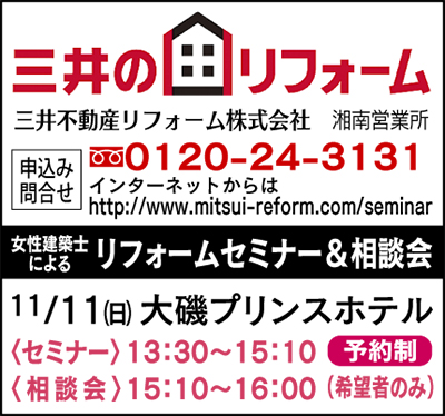 住まいへの不満や不安の解消はもちろん、エコで省エネ型住宅「スマートハウス」へのリフォームを提案してくれるセミナーが11月11日(日)、大磯プリンスホテルで開催される。時間は午後1時30分から4時。参加費無料。