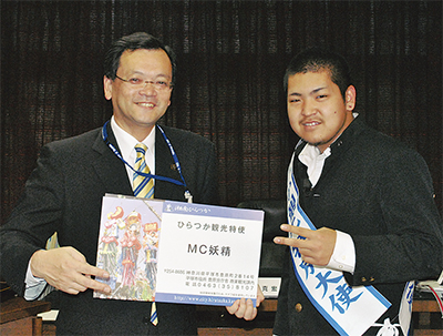「MC妖精」という名前で、平塚にちなんだラップを歌う野間井耀世(ようせい)さん(平塚農業高校3年)が、平塚市の観光特使に就任した。市は、野間井さんに市制80周年の記念ソング制作を依頼するなど、ラップを通じた観光発信を委ねる。