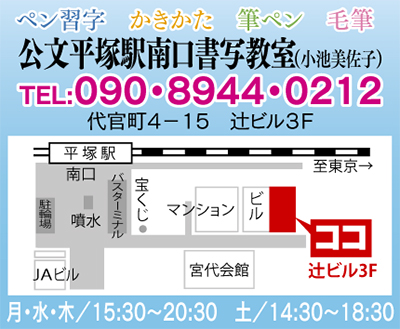 公文平塚駅南口書写教室では、ペン習字・かきかた・筆ペン・毛筆の中から、好きな教科を選んで学習できる。平日は午後8時30分まで開校しているので、仕事帰りに立ち寄る人も多く、幼児から大人、年配の人まで幅広い世代が一緒に楽しく学んでいる。