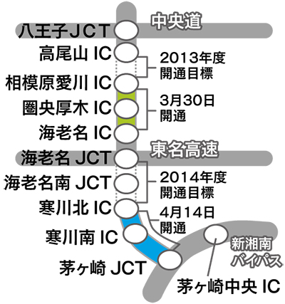 さがみ縦貫道路(圏央道)の寒川北IC(インターチェンジ)から茅ヶ崎JCT(ジャンクション・新湘南バイパス)が4月14日、午後3時に開通することが決まった。