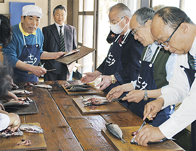 参加者達はまず、高甚商店(千石河岸52の11)に向かい、干物作りを体験。鯵の腹に包丁で切れ目を入れて臓物を取り出し、さらに切れ目を入れて1枚に開く作業に勤しんだ。「頭を開くのが難しい」などと話しながら、熱心にさばいていた。同店の外では、炭火で焼いたばかりの干物もふるまわれ、参加者達は「脂がのっていておいしい」、「干物作りの見学も体験もできて、食べさせてもらえるところはなかなかない」と、堪能している様子だった。
