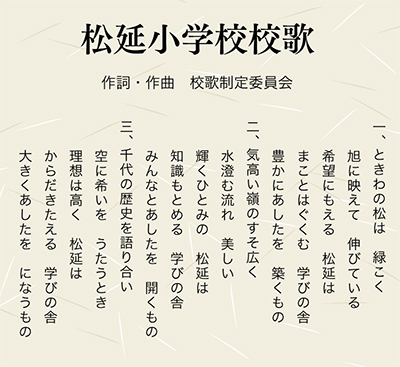 土屋教諭が手がけた明るい歌詞にメロディーをのせたのは、当時高浜高校の教諭であった桑折陽一さん。自分の生まれ育った地域と母校に末永く親しみながら生きていってほしいという思いが込められている。【取材協力/松延小学校】
