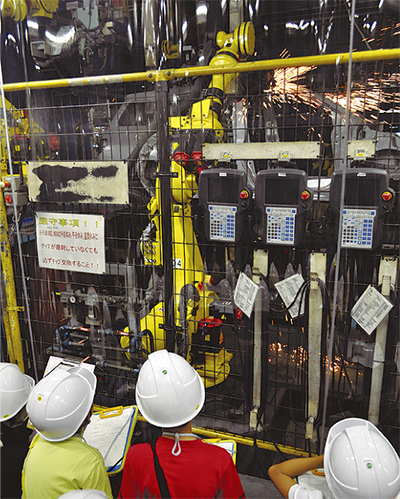 この日は松原小5年生の児童たちが見学に訪れた。透明ビニールのカーテン越し、間近に飛び散る1200〜1700度の火花と溶接ロボットの迫力に、驚きの声を上げていた。