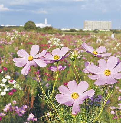 相模川河川敷の「馬入・光と風の花づつみ」のコスモスが見頃を迎えた。