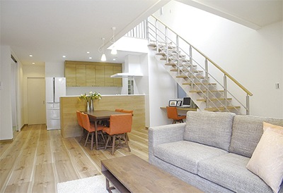 夕陽ヶ丘モデルハウスは家族が自然に顔を合わせる様に設計されている。カウンターキッチンやリビングイン階段など、互いの存在を近くに感じさせてくれる。