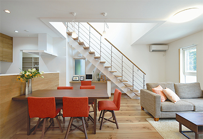 夕陽ヶ丘モデルハウスはテクノストラクチャー工法だから実現できた柱のない大空間により、家族が自然に顔を合わせる様に設計されている。期間は土日祝の午前11時から午後5時。平日は要予約。同物件はモデル開催期間終了後販売予定。市内の中里にも見学できる会場あり。