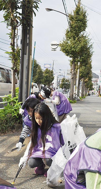 銀杏並木の色づき始めた市内平塚の東海道本通り周辺で、落ち葉やゴミ拾いを競う「スポーツ銀杏拾い大会」が9日、開かれた。7チーム、27人が参加し、約20キロの落ち葉を集めた。