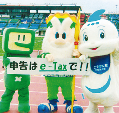平塚税務署と平塚法人会が10日、湘南ベルマーレのホーム試合で国税電子申告・納税システムe-TaxのPRを行った。マスコットの「イータ君」=写真左=と法人会の「こうけん君」=同右=が登場、ベルマーレの「キングベル」=同中央=と利用を訴えた。