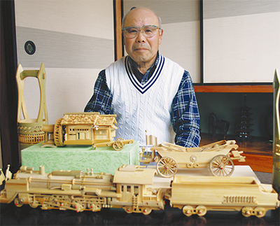 「昔は物がなかったし、作るのが好きだから」。5歳頃から竹で物を作っていた。機関車、御所車など作品の図面は自分で起こし、1年寝かせた竹から、使う箇所に合わせて切り出す。展覧会など開いたことはなく、友人から「もったいない」と言われることもある。