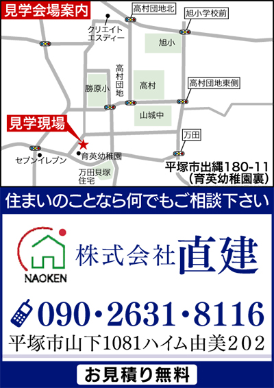 設計・施工を手がけたのは、(株)直建(高瀨直也社長)。今月19日(土)・20日(日)の2日間、完成現場見学会を開く。時間は両日ともに午前10時〜午後4時。