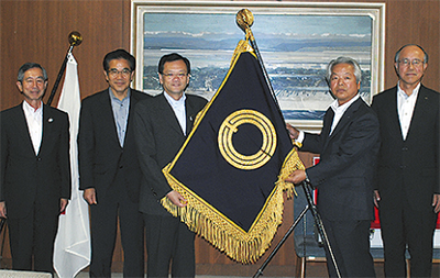 平塚市役所の新庁舎1期工事完成を記念して、5月30日、平塚信用金庫から平塚市へ市旗が贈呈された。