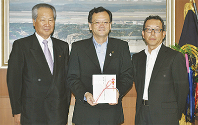 12日、同社総務部の矢作幸一部長が市役所を訪問。落合克宏市長と福澤正人同まつり実行委員長(平塚商工会議所会頭)に目録を手渡した。