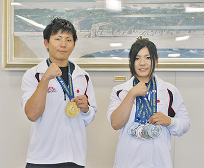 仙台市で6月に催された第13回アジアオープンアームレスリング大会に出場した市内在住の会社員、芝岡美津穂さん(21)と洋裕さん(19)の姉弟が好成績を収め21日、市役所で落合克宏市長に結果を報告した。