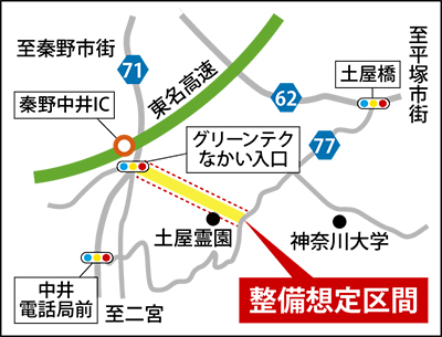 土屋橋交差点から中井町方面へ抜ける県道77号(平塚松田線)のバイパスとして、土屋霊園入口付近と中井町のグリーンテクなかい入口交差点付近の約1・7Kmを結ぶ計画。県道77号は急峻で道幅の狭い箇所が多く、風水害時の土砂崩れなども懸念されるため、市は2009年度から秦野市、中井町と道路整備の必要性やルートについて検討会議を開いてきた。