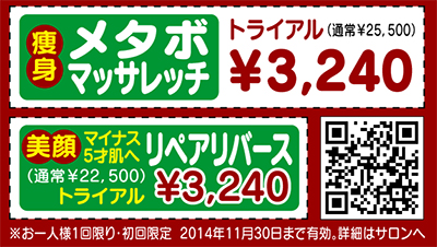 この女性、年齢は39歳。お酒が大好き&不摂生がたたってみるみるうちに10キロ増。「エステならキレイに痩せられるかもしれないと、体験したのがメタボマッサレッチ。インナーマッスルに作用するマシン・ボディセラプロがすごかった。寝ているだけのマシンだったのに、2日後に、腹筋をやったときのように筋肉痛が来た。本能で、これは本当に効くコースだと感じた。俄然やる気が湧いてきて、集中的にサロン通い。57キロだった体重が48キロになるのに長い時間はかからなかった」。変わったのは身体だけでなく「意識」だという。気持ちも変わってすべてが好転し出したという。一番うれしかったのは、ご主人がお友達から「おまえの奥さん、キレイになったな」と言われたこと。今は「エステは楽しい。現状維持が目標」だそうだ。