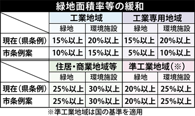 平塚市の条例案は、樹木や芝といった緑地面積率を現在適用する県基準から工業地域で5%、工業専用地域で10%引き下げ、屋外運動場や文化施設といった環境施設の面積率も同割合で緩和する。屋上緑化などを緑地面積に算入できる重複緑地の算出率も25%から50%以内に緩めた。